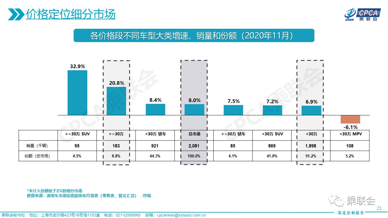 • 各价格段不同车型大类增速、销量和份额——2020年11月及累计