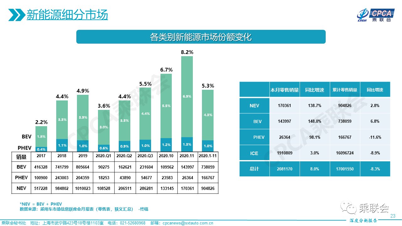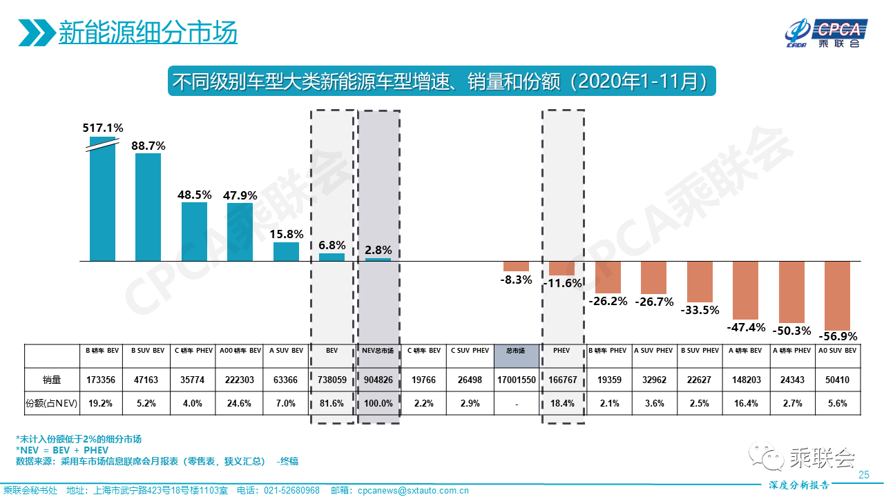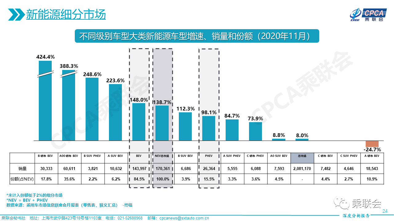 • 不同级别车型大类新能源车型增速、销量和份额——2020年11月及累计