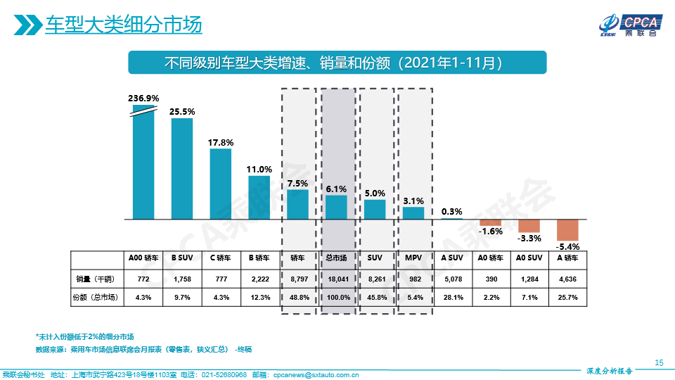 (含各车型大类市场份额变化及不同级别车型大类增速、销量和份额——2021年11月及累计)