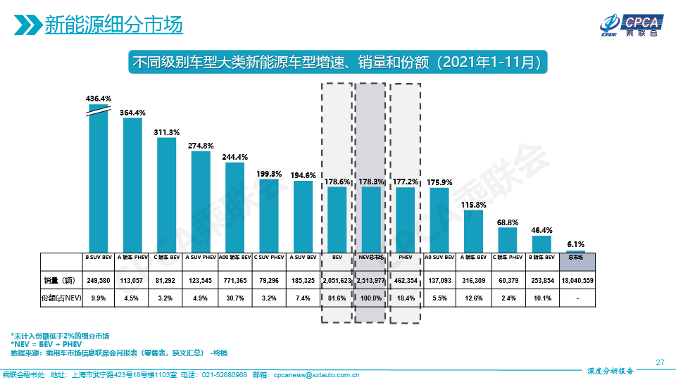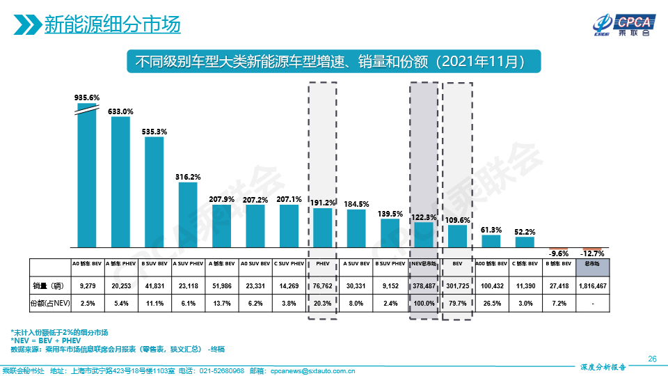(含各类别新能源市场份额变化及不同级别车型大类新能源车型增速、销量和份额——2021年11月及累计)